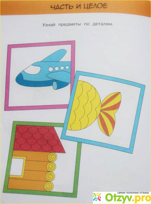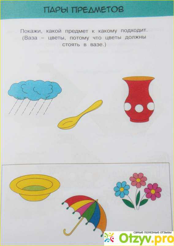 К примеру в первой части пособия много заданий на развитие мышления и логики, необходимо найти пару указанному предмету, найти отличие между предметами, найти предмет по контору.