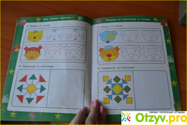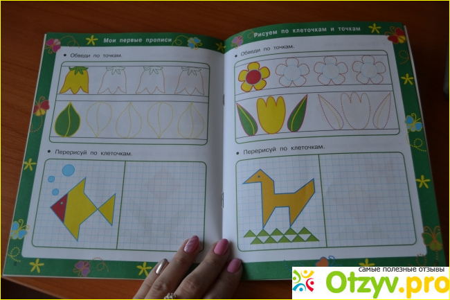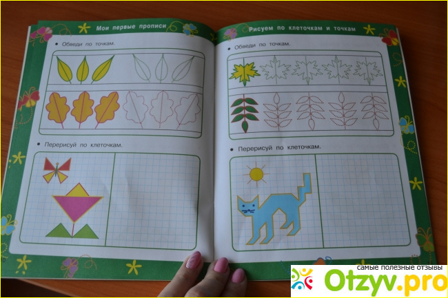 На каждой странице 2 типа заданий. Обвести по точкам и нарисовать по клеточкам. Сложность идет по нарастанию.