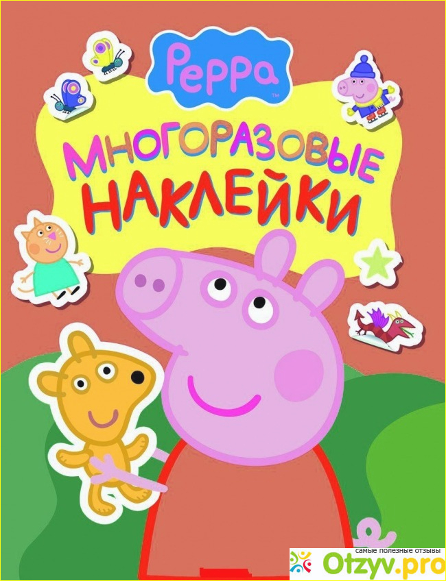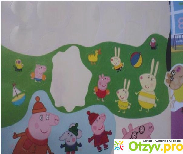 На изображении видно, как выглядит фрагмент замечательной детской книжке с наклейками, которая называется: " Книга Свинка Пеппа. 100 наклеек " и это как раз листик с многоразовыми наклейками. (посмотрите пожалуйста на фотографию суперобложки этой книги, которую я разместила внизу под данным текстом, там все и увидите, что я описала) :