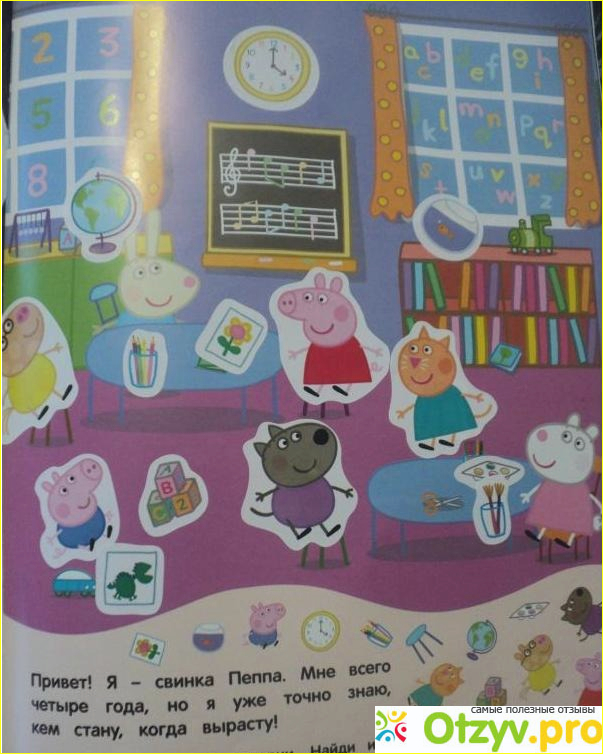 На изображении видно, как выглядит фрагмент замечательной детской книжке с наклейками, которая называется: " Книга Свинка Пеппа. 100 наклеек " и это первая история Свинка Пеппа в школе. (посмотрите пожалуйста на фотографию суперобложки этой книги, которую я разместила внизу под данным текстом, там все и увидите, что я описала) :