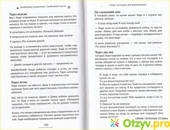 До этого так же имела дело с подобного рода литературой и отметила то, что Книга Свободные родители, свободные дети более простая для понимания. Здесь не просто идет сухой текст, а именно по каждой проблеме, которая может возникнуть при общении с ребенком дается ряд способов все решить и при этом не дать разгореться конфликту. На каждую отдельную проблему так же есть и конкретные случаи из реальной жизни и то, как родителям удалось все уладить.