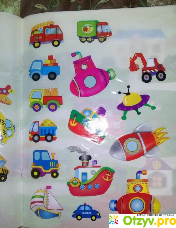 Их нужно клеить на определённую страницу, ребёнок быстро и в игровой форме видит разницу между легковой машиной и грузовой, может сосчитать количество колес и, что немаловажно, по этой книге ребёнка легко научить различать цвета: они сочные, очень яркие.