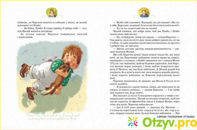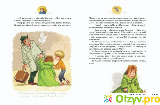 Сюжет добрый, но не приторный - такой, который будет интересно прочитать современному ребенку. Ведь нынешние дети с самых младых лет умеют пошутить, сказать что-нибудь юморное и оригинальное. Им будет понятен главный герой - смешной Карлсон, который ведет себя смешно, но по-доброму, и все его шутки и действия пропитаны добром и заботой к малышу.