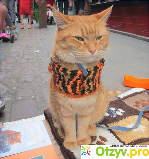 А вот собственно и кот Боб, позади него его хозяин Джеймс - уличный музыкант. Который теперь стал знаменит на весь мир, только благодаря рыжему коту. А зеленый шарфик это приятный жест от обычных прохожих.