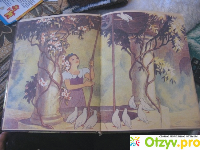 Шрифт, правда, мелковат - мне это не очень понравилось. А также хочу сказать, что картинки не очень яркие, но все они - иллюстрации с мультиков Уолта Диснея, которые нам хорошо известны. Помню, даже, когда была маленькая и смотрела эти мультики, несла книгу, чтобы увидеть в ней соответствующий кадр из мультика.