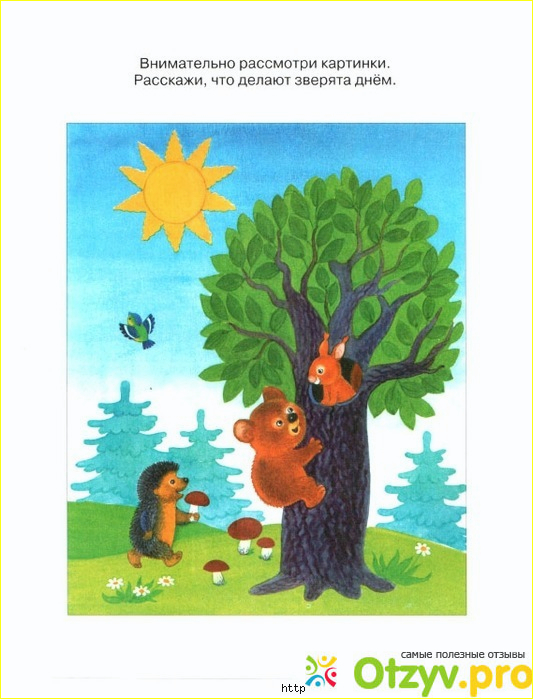 И так, что же собой представляет данная книга. На самой первой странице идет обращение автора к родителям ребенку, в котором она рассказывает о том, для чего это книга, чем она поможет ребенку, и как с ней заниматься. В книге изображены очень яркие, красочные картинки на которых изображены день и ночь. Так например, нарисована лун и солнышко и ребенку предлагается выбрать, что же светит днем, а что же ночью. Далее идет жизнь зверей днем, и что они делают ночью, ребенку предлагается описать все то что он видит на картинке.