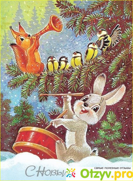 На шестой открытке веселые музыканты. Белочка трубит на трубе, ну а зайчишка играет на барабане, выстукивая каждую нотку. Солистки синицы поют свои новогодние песенки. Настоящее торжество.