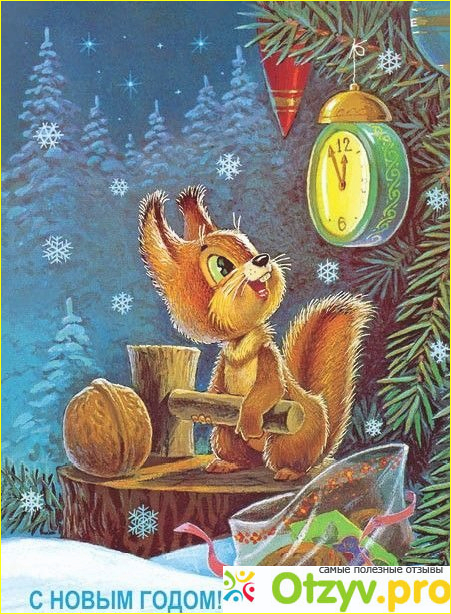 Сюжет седьмой открытки-ожидание 12 часов. Белочка тщательно готовит свой праздничный стол, разбивая орешки, подаренные Дедушкой морозом. Поглядывает на часы, чтобы вдруг не пропустить наступление Нового года. Бельчонок яркий и красивый, так и хочется окунуться в атмосферу праздничного леса и его сказочных жителей.