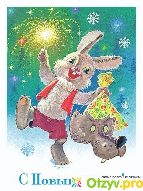 Веселый зайка с бенгальским огоньком и маской волка весело шагает и поет. Это изображение восьмой открытки . Новый год наступил, урааа!.