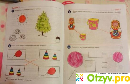 Когда в пособии рассказывается о геометрических фигурах, воспитатель посоветовала при изучении каждой фигуры показывать ребенку эту фигуру в объёме (кубик, мячик и т. д.) - это поможет позже в изучении геометрии, так как развивает навыки пространственного мышления.