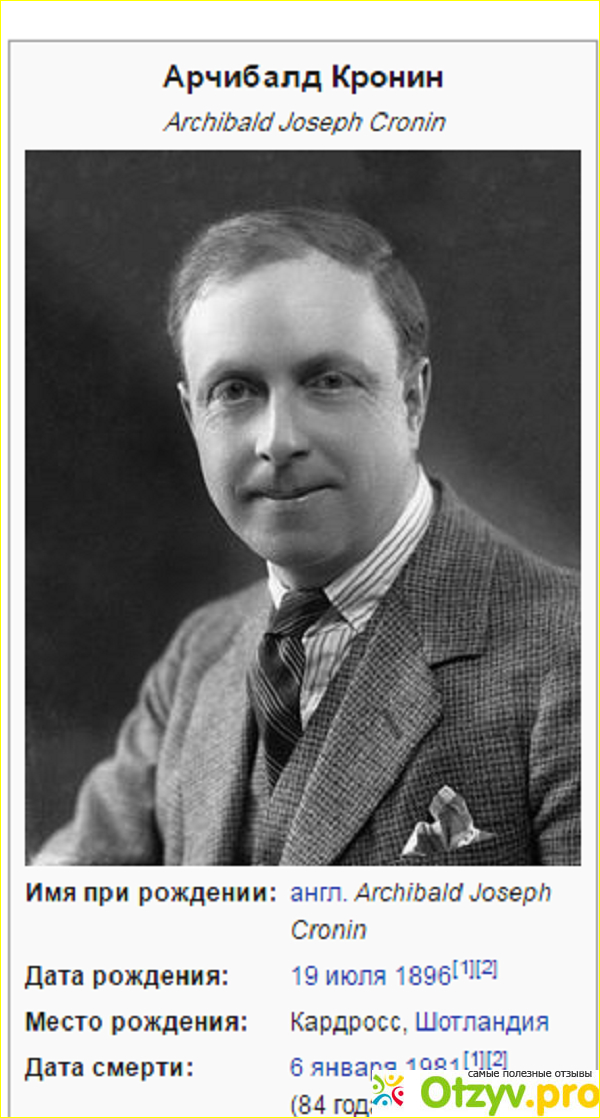 Совсем недавно обратила внимания на один роман из классической литературы. Автор этого романа Арчибалд Кронин, я немного прочитала про этого автора.