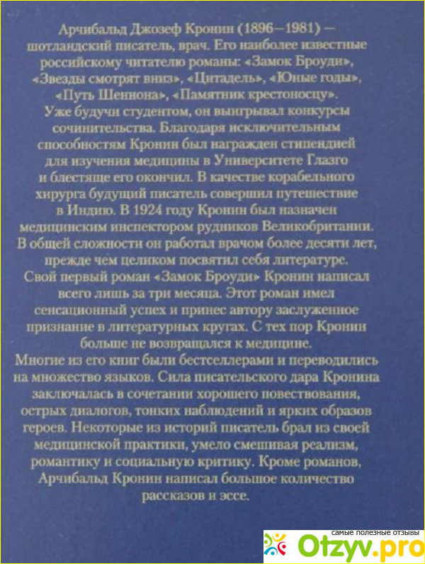 А. Д. Кронин это шотландский (британский писатель), который работал сначала врачом. Но после того как вышел его первый роман «Замок Броуди», писатель перестал заниматься врачебной практикой и посвятил себя работой над романами.