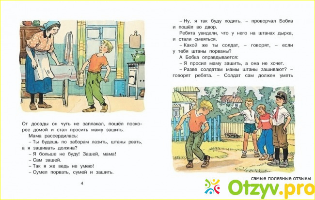 Одним из таких классических рассказов является «Заплатка». Эта книга учит самостоятельности и ответственности. Мама штаны купила, ребенок порвал, а зашивать маме? Нет уж! Тем более что он не просто нечаянно это сделал, а через забор лез, а зачем через забор лазить, тем более в новых штанах. Хорошая мораль истории. Главное, что с положительным концом. Ребенок не просто «проштрафился», и всё на этом закончилось, ему не просто стыдно, он исправил ситуацию и реабилитировался не только перед мамой, но и друзьями. Научился ставить красивые заплатки и решил, что скоро освоит еще одно новое дело. Отличная история для младших школьников.