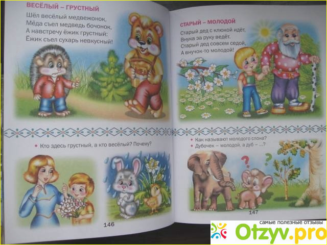 А далее идет простая математика, здесь ребенок учиться понимать прилагательные, такие как большой-маленький, чистый-грязный, высокий-низкий и так далее. К каждому ткому прилагательному идет стишок, а внизу страницы есть вопросы, на которые ребенок должен ответить, по изученным только что прилагательным.