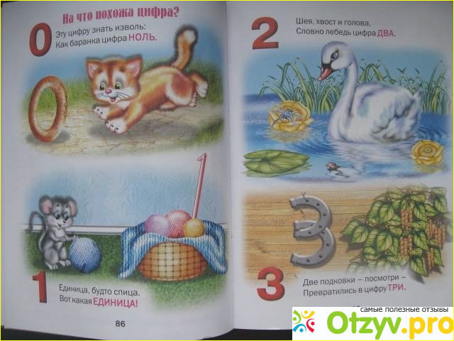 Далее начинается раздел цифры и счет. Здесь тоже все очень ярко, красочно, цифорки изображены в виде различных предметов на которые они похожи, например цифра ноль изображена в виде баранки, а цифра два в виде лебедя, и так же здесь собраны стишки на данные темы.