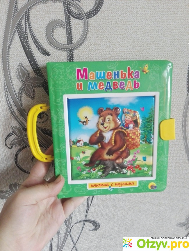 У книжки есть ручка пластмассовая и сбоку застежка. Получается что-то вроде сумочки, ребенку интересно и это еще поносить ее.