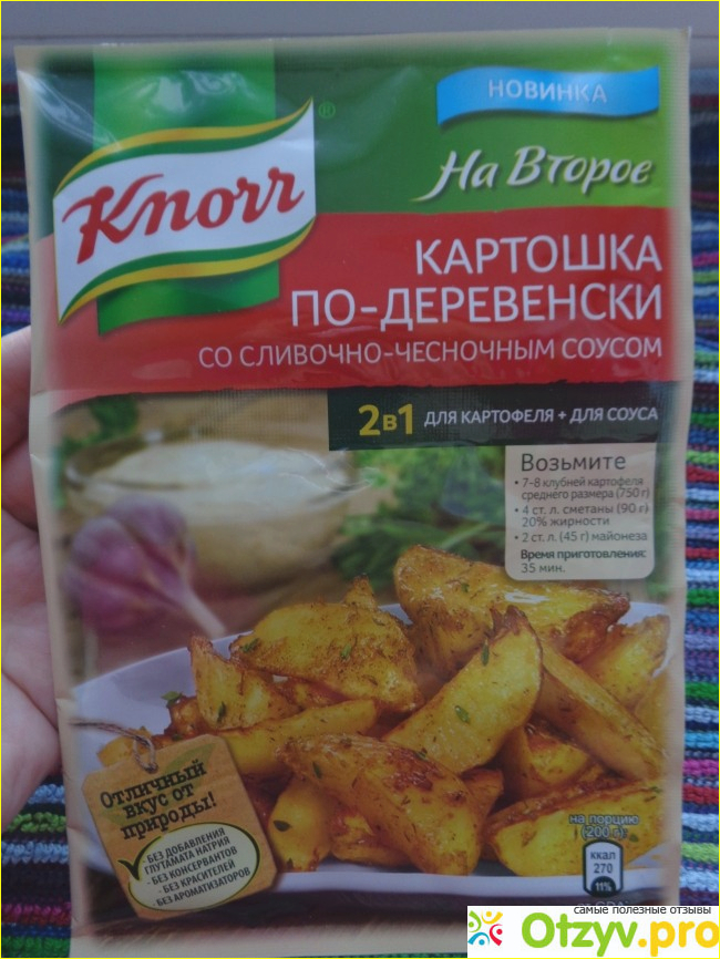 Для любительниц сочной приправы есть отличная новость или приправа Knorr на второе "Картошка по-деревенски со сливочно-чесночным соусом" , совершенно простая в использовании с достаточно неплохим составом содержимого.