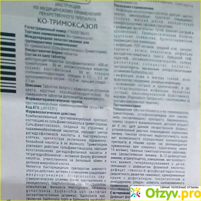 К тому же начались небольшие инфекционные осложнения по женской линии, которое заняли всё мое внимание. Врач гинеколог мне посоветовала попробовать препарат КО-ТРИМОКСАЗОЛ. Так как это противомикробное средство широкого спектра воздействия. Изучая инструкцию после приобретения препарата, я увидела, что оно также помогает при различных инфекционных заболеваниях кожи и мягких тканей в том числе от фурункулов, гнойников и так далее. Такое широкое действие меня обрадовало, и я решила незамедлительно его начать принимать. Но в начале приведу краткую информацию из инструкции к препарату, чтобы вы имели представление, от чего ещё могут применяться эти таблетки.