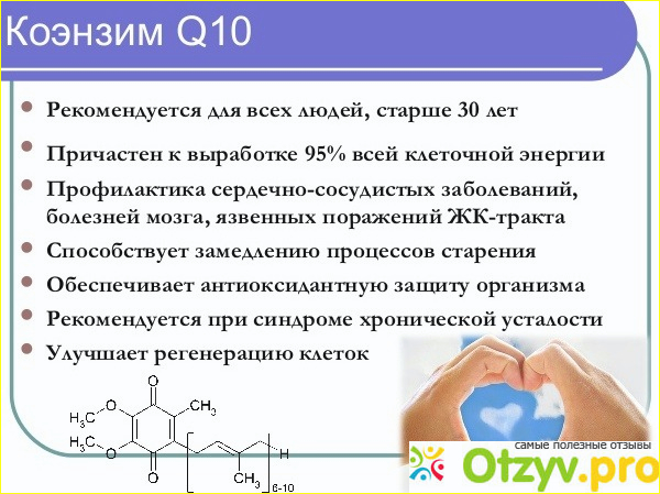 Коэнзим q10 помогает вырабатываться энергии в сердечном мышце и тем самым, защищает нас от распространенных сейчас сердечно-сосудистых заболеваний. Также он обеспечивает нам антиоксидантную защиту, уменьшая количество свободных радикалов в организме, которые окисляют наши клетки и приводят к их ускоренному старению. Убихинон также помогает в предотвращении образования тромбов, а, как мы знаем, тромбы - это одна из главных проблем современных людей. Если тромб вдруг оторвется, можно умереть.