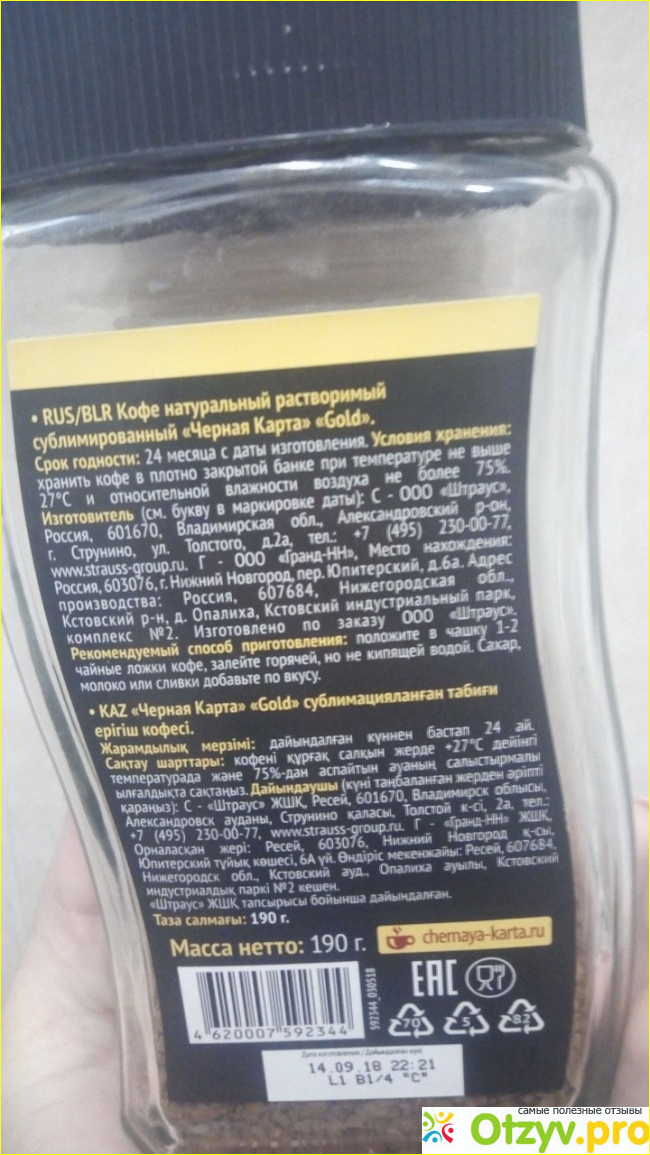 Этот способ позволяет лучше сохранить аромат и вкус, но более энергозатратен и дорог. Если покупаете растворимый кофе - выбирайте сублимированный. Другой способ "сушка распылением", при котором разбрызгиваемый кофейный экстракт высушивается встречным потоком горячего воздуха дешевле, но дает продукцию худшего качества. Кофе "Чёрная карта Голд" относится к средней ценовой категории, и по качеству твёрдый середнячок. Продается в закручивающихся стеклянных банках. Состав производителем не указан. Масса нетто 95 г. Стоимость около 200р.