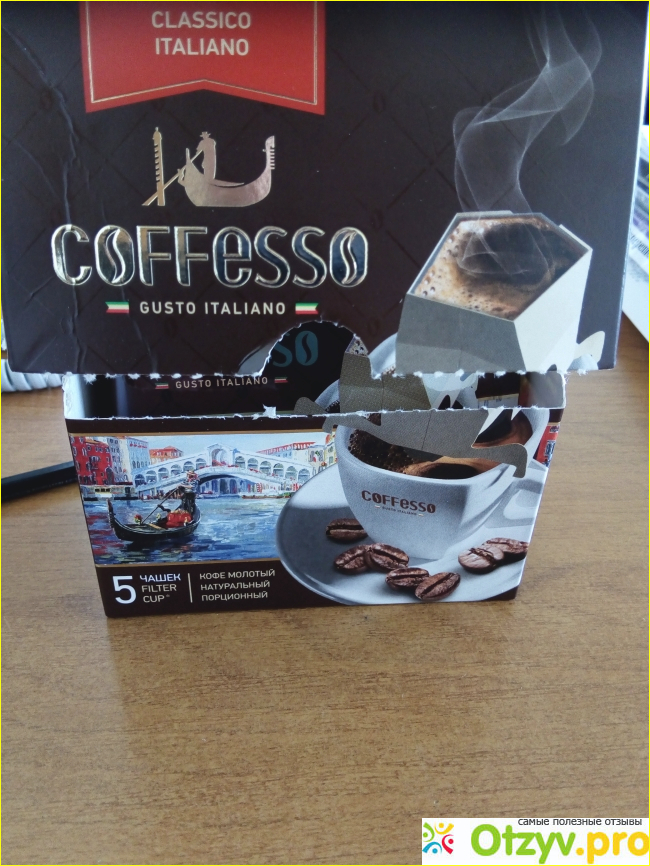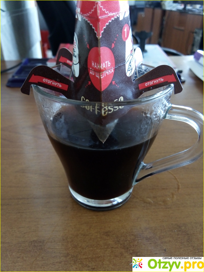 Мне понравилась необычная конструкция, когда фильтр с молотым кофе ставится на картонные ножки. На упаковке понятная инструкция о том, что где отогнуть и куда нажать до характерного щелчка.