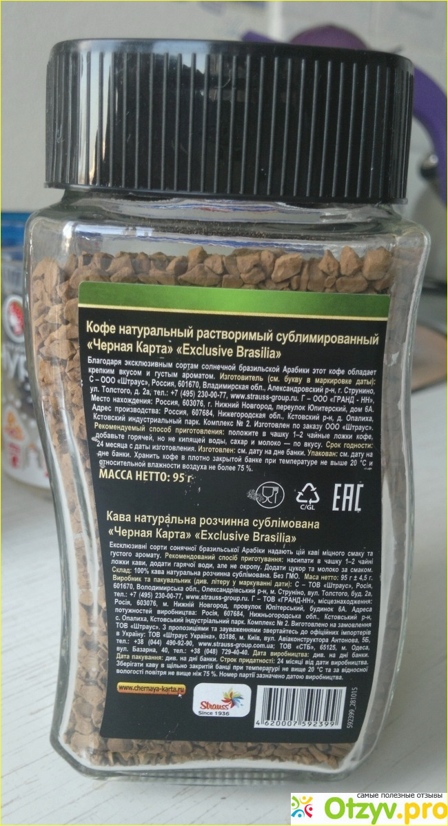 Произведен из сорта кофе Арабика в России, Владимирская область, г. Струнино.
