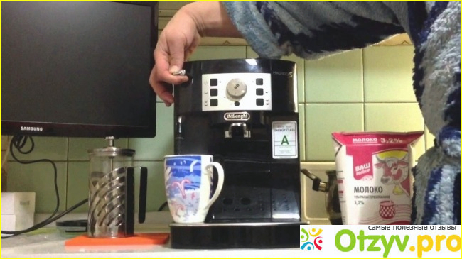 При первом включении машины производится выставление жесткости воды. Нагрев воды сопровождается миганием желтого индикатора. Нажатиями на специальные клавиши выбираются режимы работы устройства, например, вы хотите получить эспрессо или например, Американо.