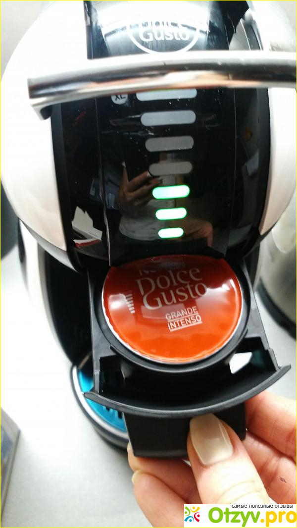 В самом верху на корпусе прибора располагается кнопка с включением. После ее нажатия она начинает светиться. Чуть дальше этой кнопки располагается специальный рычаг. Он позволяет выставить нужное количество воды на одну кружку. Какое именно количество воды нужно выбирать на определенный вид капсулы указывается уже не посредственно на самой коробке с капсулами. Поэтому вы просто должны следовать инструкции.