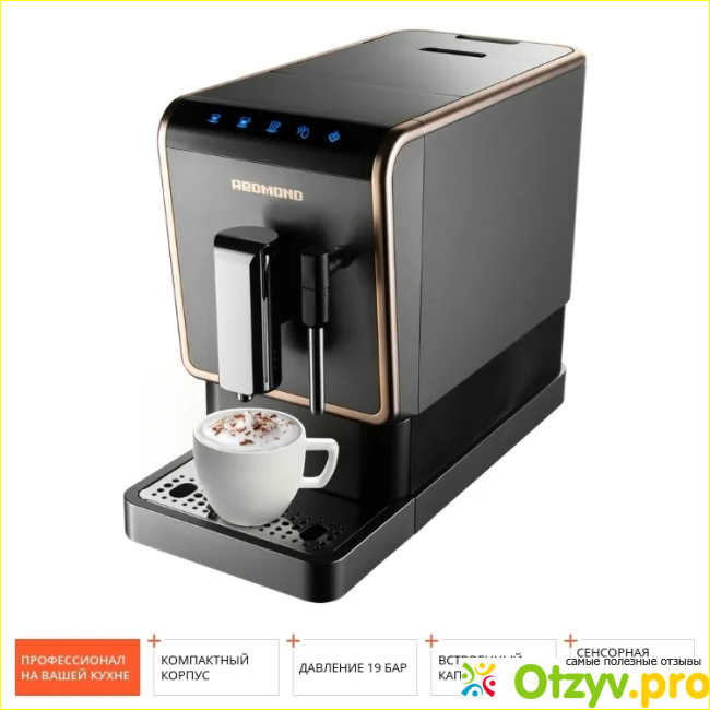 В кофемашине от Redmond собрали все лучшее. Качество конструкции и используемых материалов, кофемашина выглядит потрясающе. Главный критерий, это давление. Здесь давление 19 бар, что позволяет вытянуть из зерна все самое лучшее. Как результат насыщенный и ароматный кофе. Кофемолка работает отлично. Большой погрузочный бак, несколько степеней помола, контролируем в зависимости от сорта зерна. Встроенный капучинатор быстро взбивает молоко с помощью пара, и можно приготовить уже не только американо и эспрессо, но и латте и капучино и другие виды кофе. Понятные изображения на панели управления, картинки и четкие и по ним легко определить за какое действие каждая кнопка отвечает. Кофемашина со всем своим функционалом еще и компактная. Отлично подойдет как для маленькой, так и для большой кухни. Рада принятому своему решению.