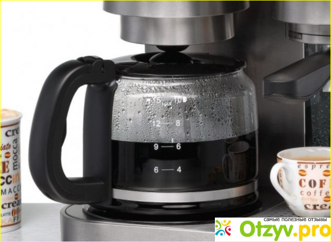 Кофе-машина: красивый кувшин из стекла, который имеет объем сразу на 10 чашечек; резервуар для воды встроен он идет 1,5 л, на нем имеется внешний индикатор, который показывает уровень воды; элемент фильтрующий является съемным 1 x 4 также есть ограничитель капель; благодаря варочному душу, кофе получает максимальный аромат, а также простоту использования; плита горячая плита имеет антипригарное покрытие; прибор автоматически отключается.