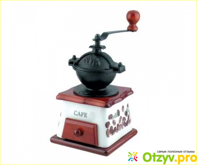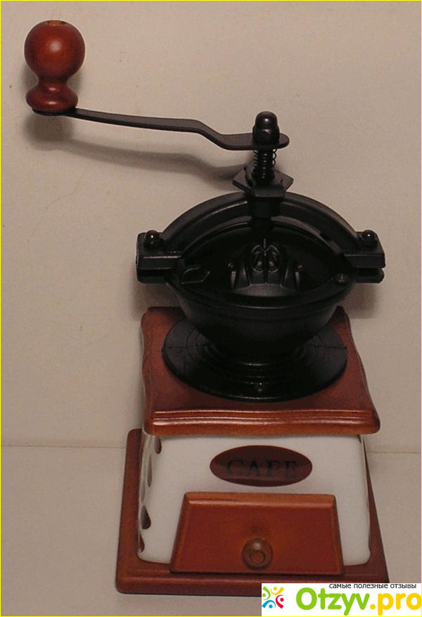 Данная кофемолка имеет ящик для сбора кофе. Корпус выполнен из дерева и керамики.