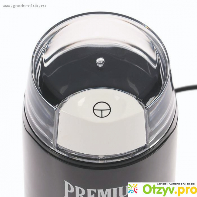 Спереди на корпусе у нее находится надпись на английском языке Премиум кофе. А в самом низу нанесен логотип производителя. Модель поставляется в разобранном виде. Но на ее сбор у вас уйдет меньше пол минуты. Так как она состоит всего из двух элементов. А именно основного корпуса и верхней крышки. Работает такой прибор от сети. И это безусловно ее достоинство. Так как для перемалывания кофе прибору нужно достаточно количество мощности. При этом длина сетевого шнура достаточно большая и она составляет один метр. За счет этого прибор очень удобно использовать.