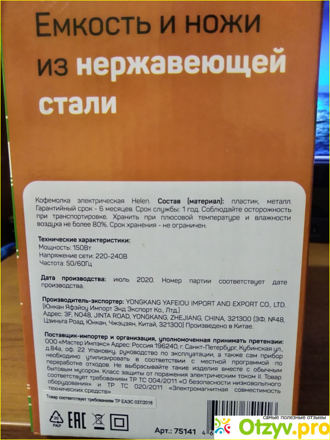 Испытание прошла в первый же день на "отлично". Кофемолка небольшая, емкость чаши всего 40г. в комплекте есть инструкция на русском языке, гарантийный срок - 6 месяцев.