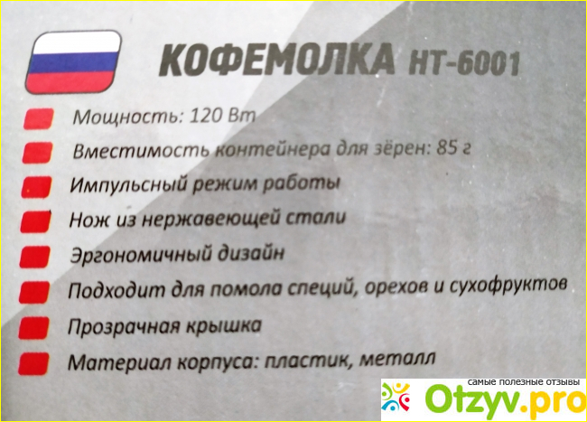 Все важные характеристики на обратной стороне упаковки и все соответствуют тем, что обещаны производителем. Кофемолка мне нравится, муж тоже доволен. Размалывает кофе и орехи, как и обещано, сухофрукты не пробовала. Еще я её использую для измельчения семян льна, справляется за считанные секунды.