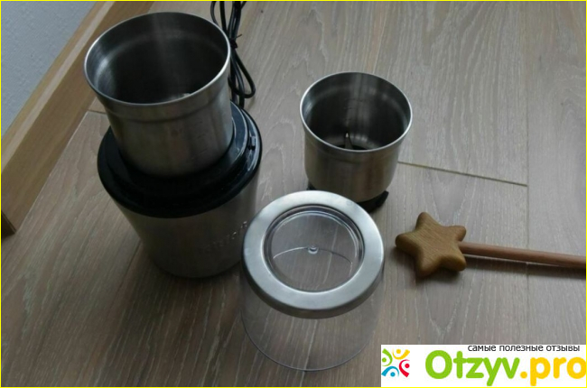 - предусмотрено две чаши - в одной чаше можно молоть зерна, когда это необходимо, а в другой чаше - можно перемалывать специи, сахар и другие продукты, которые необходимо измельчать. При этом нет необходимости постоянно мыть чашу. А если она загрязнилась и нужно помыть, тогда ее можно с легкостью снять,