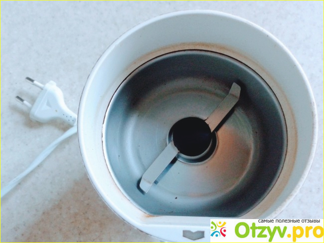 Сделана кофемолка из белого пластика, чаша для помола и ножи сделаны из нержавеющей стали. Ножи расположены слегка под углом, что обеспечивает прекрасный, мелкий помол. Хоть в описании и заявлено, что степень помола не регулируется, это не сложно сделать "на глазок" просто сократив время помола.