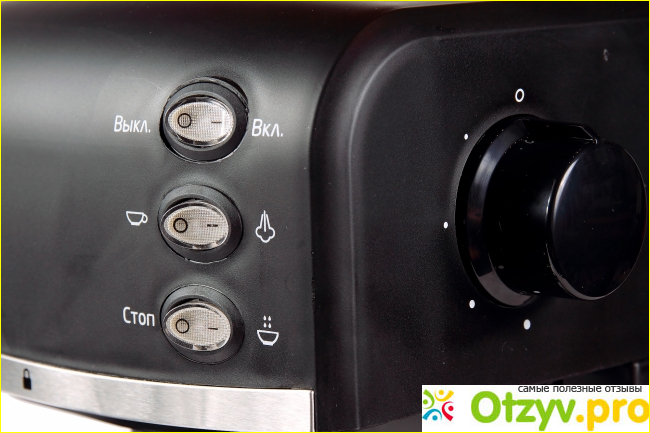 На лицевой стороне корпуса мы видим логотип организации, три кнопочных переключателя, любой из которых отвечает за свои задачи и режимы. Поверх них есть металлическая трубка кофеварки капучинатор со съемным соплом. Под рогом находится пластиковый поддон для капель и металлическая подставка для него. На правой части корпуса устройства находится кнопка громкости пара. Управление кофеваркой осуществляется механически с поддержкой 3 кнопок переключения. Тут нет звукового предупреждения, первая кнопка-включение/выключение устройства; вторая-переключатель пара/кофе; третья-включение насоса. Ручка с правой стороны вращается, отвечающая за подачу пара и регулирование объема.