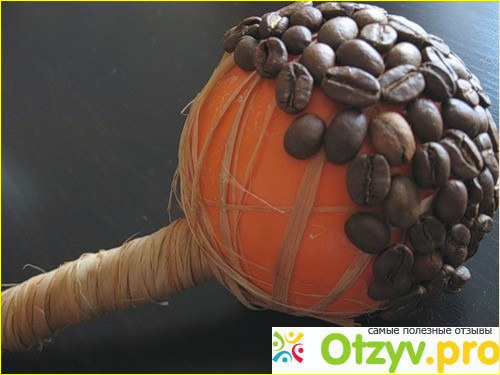 Крона изготавливается из зерен кофе, которые клеятся клеевым пистолетом на шар из пенопласта. Здесь очень важно заполнить все промежутки зернами.