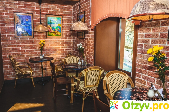 "Кирпичные" обои, картины на стенах, приглушенный свет, плетенные светло-коричневые стулья, черный "кофейный"-все это так "вкусно" подобрано. И несмотря на маленькой пространство кофейни, все это расставлено умело, что даже не мешает друг другу.