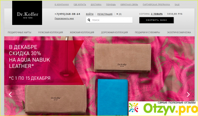 В шапке сайта интернет-магазина расположена информация о данном магазине, где купить товар, способ доставки, помощь, обратная связь с магазином. Чуть ниже расположен каталог из товаров- мужская коллекция, женская коллекция, дорожная коллекция, подарки и сувениры, экзотическая кожа. В самом центре сайте располажается информация о акционных предложениях, скидках проводимые интернет-магазином в виде слайд-презентации.