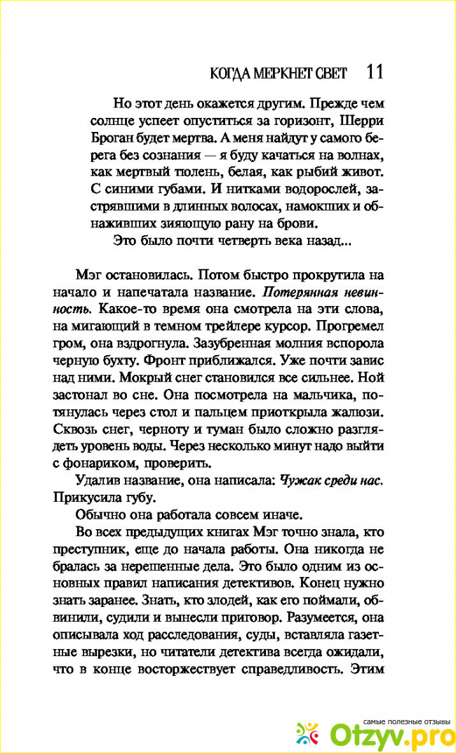 Для меня детектив не был особенно захватывающим. Ситуация очень простая убитая Шэрри Броган юная шлюшка, у которой были сексуальные отношения с половиной города. У нее было множество любовников, и сразу становится понятно, что кто-то из них ее и убил. Мэг мучается прежде всего потому, что она знает правду, но ее собственный мозг защитил ее от этой информации. Периодически в ее голове всплывают образы, но ей нужно основательно во всем разобраться, чтобы быть уверенной в том, что это не игра воображения.