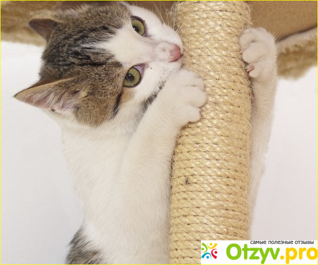 Комплекс отличается от обычной когтеточки тем, что это еще и место для игр, спальное место и пункт для наблюдения. Она представляет собой основу с двумя ярусами и основаниями для лежания. В принципе рассчитана как раз на две кошки. Сверху есть еще третий небольшой ярус для наблюдения за своими владениями. Основы отделаны мягким материалом, который приятен по ощущениям для кошачьих лапок. Между "этажами" есть подвесной помпон, с ним можно поиграть, погонять его лапой. А сами столбики отделаны джутовой веревкой, которая предназначена как раз для точения когтей.