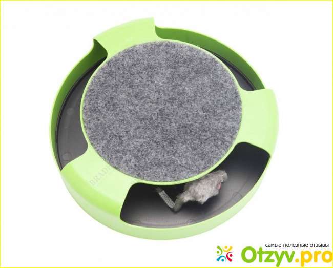 Это отличная вещь для котят и молодых кошек, в которых дух охотника особенно силен. Предмет имеет основу из пластика жизнерадостного салатового оттенка, производится в Китае и обошелся мне в 700 рублей. Сверху на круглой пластиковой основе имеется специальный материал, который и служит когтеточкой, напоминает валенки. Внутри основы на палочке вклеена игрушечная мышка, которую ловят кошки. Ее нельзя вытащить, но можно гонять по кругу и резвиться с ней.