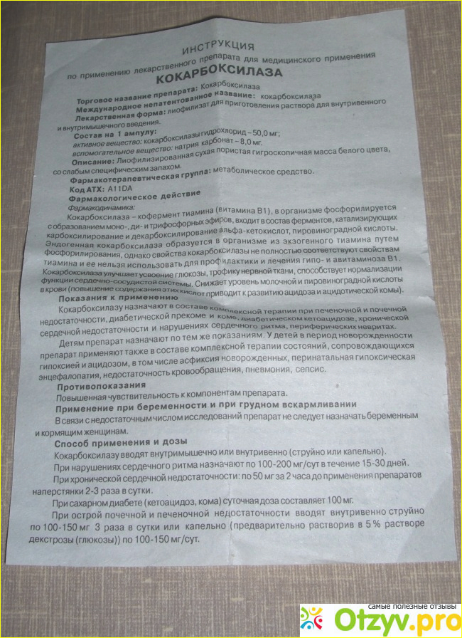 С данным препаратом знакома не только в рамках лечения людей, но и приходилось лечить домашнее животное с его помощью. По сути этот препарат можно отнести к витаминам, которые помогут укрепить сердце, а так же положительно повлияют на углеводный обмен. В состав препарата входит гидрохлорид кокарбоксилазы и натрия карбонат.