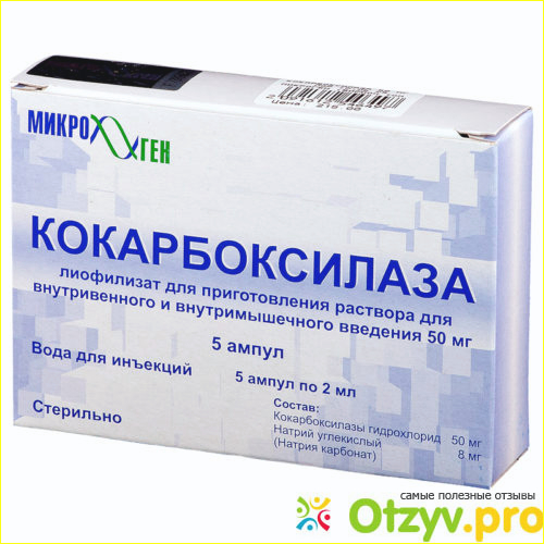 Продается в картонной коробке и содержит пять ампул с лиофилизатом кокарбоксилазы (порошок) и пять ампул с водой для инъекций.