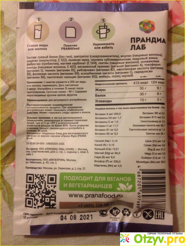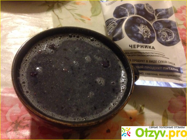Продукт в виде порошка, разводится легко водой, любым молоком или соком. По своей консистенции он чуть густоватый, его необходимо сначала выдержать около 5 минут в жидкости, чтобы все компоненты хорошенько растворились, а затем взбить ложкой, блендером или в шейкере. На вкус очень приятный, с черничным оттенком и натуральными сублимированными ягодами, которые приятно есть и они напоминают о лете, особенно сейчас, когда на улице холодно и хочется тепла и солнца.