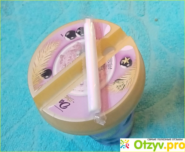 На стаканчике и на крышке написано золотыми буквами по-английски "Слегка встряхни". Вот только не поняла, к чему там какие-то колоски. Буду считать, что просто для красоты. Они создают с золотистой крышкой единый ансамбль.