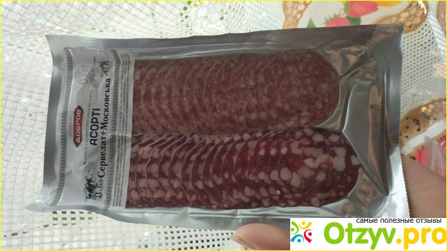На новый год для праздничного стола я купила уже готовую порезанную колбаску, так как возиться с нарезкой не было ни времени ни желания. Я выбрала колбасу от мясокомбината Добров Ассорти "Сервелат+ Московская".