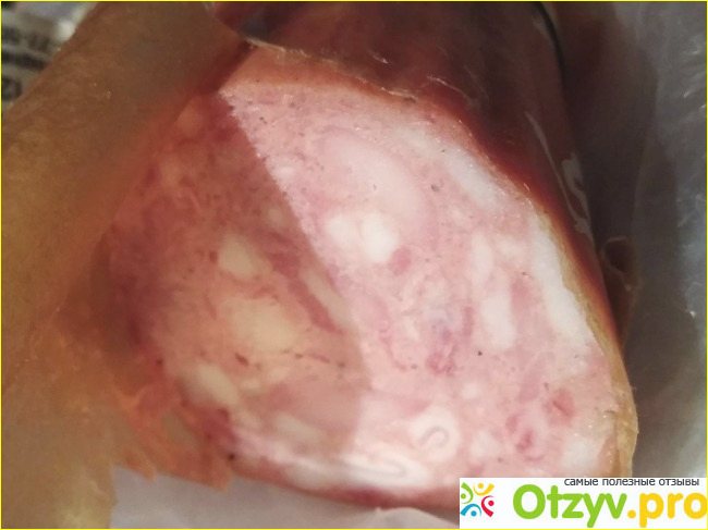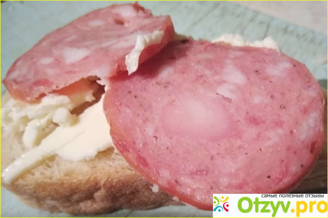 Туба запаяна железными скобами. Кожура приближена к бумажной по консистенции. Я её выбросила после чистки, животным давать там нечего. Чистится она хорошо и быстро, прямо соскальзывает. Колбаска режется тонко. Во всей качалке ничего нехорошего не попалось. Цвет приятный розовый. Куски сала крупные, мягкие. Аромат колбасный, специи слышны плохо. Откусывается мягко. Не резиновая, даже такое чувство, что тает во рту. Кажется немножко сладенькой. Кушать её вкусно особенно, на булочке с маслом.