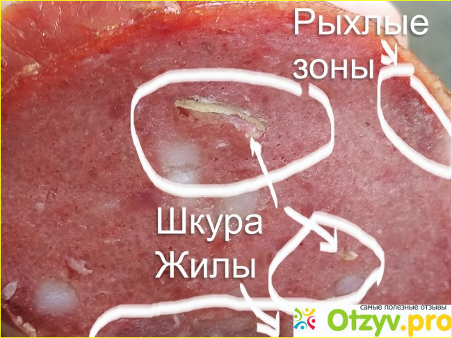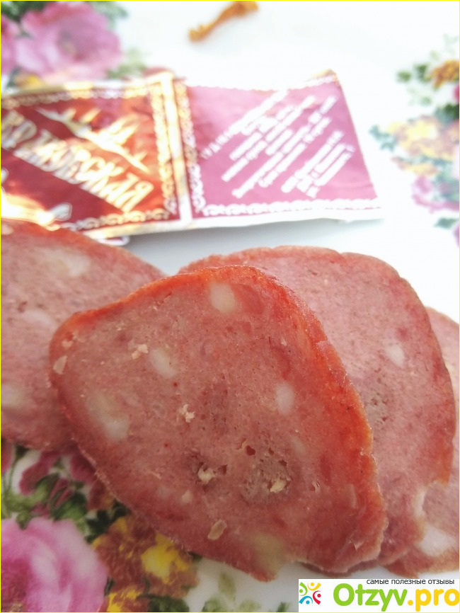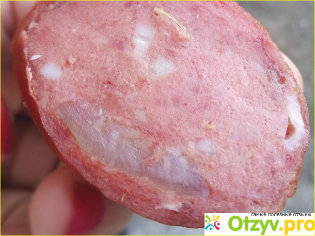 Цвет её внутри тоже красный, но всё же к шкурке она ярче. Шкурка снимается легко, не чехлом, но легко и очень тонко. Остальная её часть довольно мягкая. Только на бутерброде всё равно не всегда получается перекусить зону шкуры, миллиметра три. И тогда тянется весь кусочек. Тут уже приходится удерживать её руками. Скозь шкурку видно сало, но к сожалению много жилок и шкурок. И в то, что это «Высший сорт» не верится абсолютно.